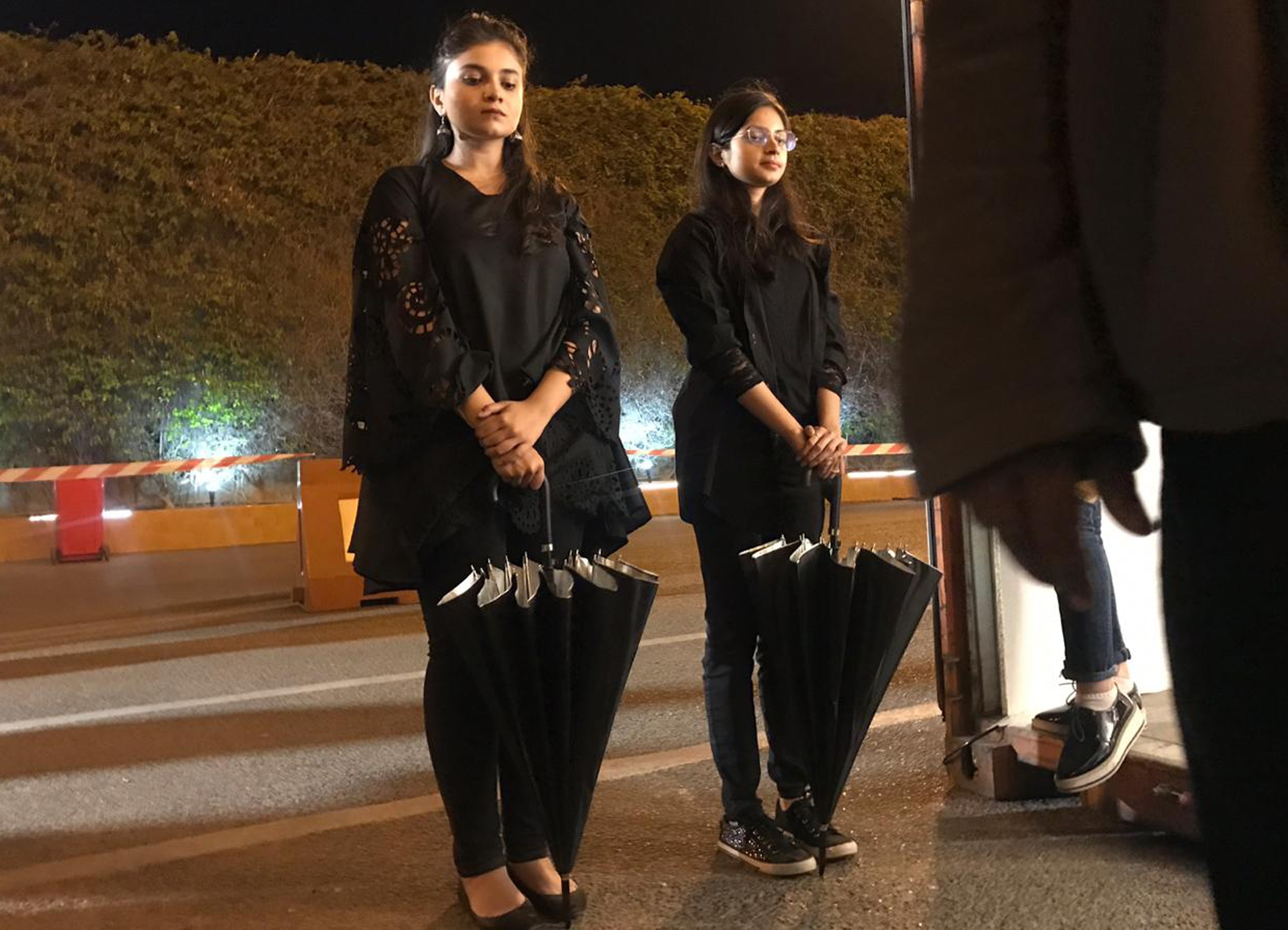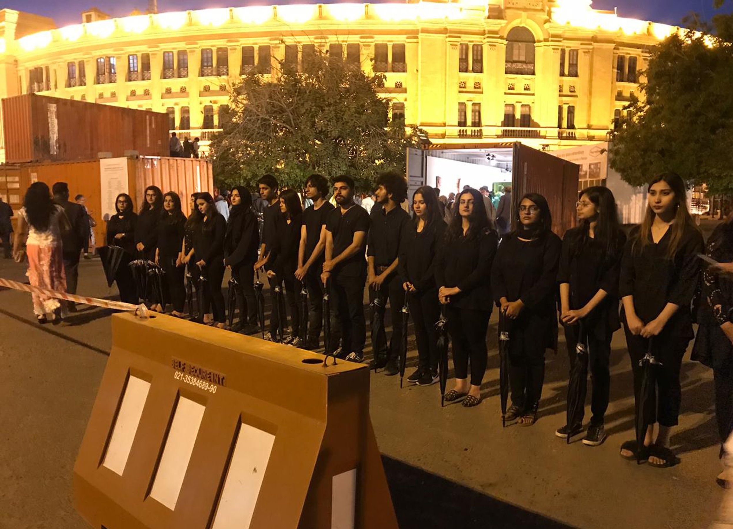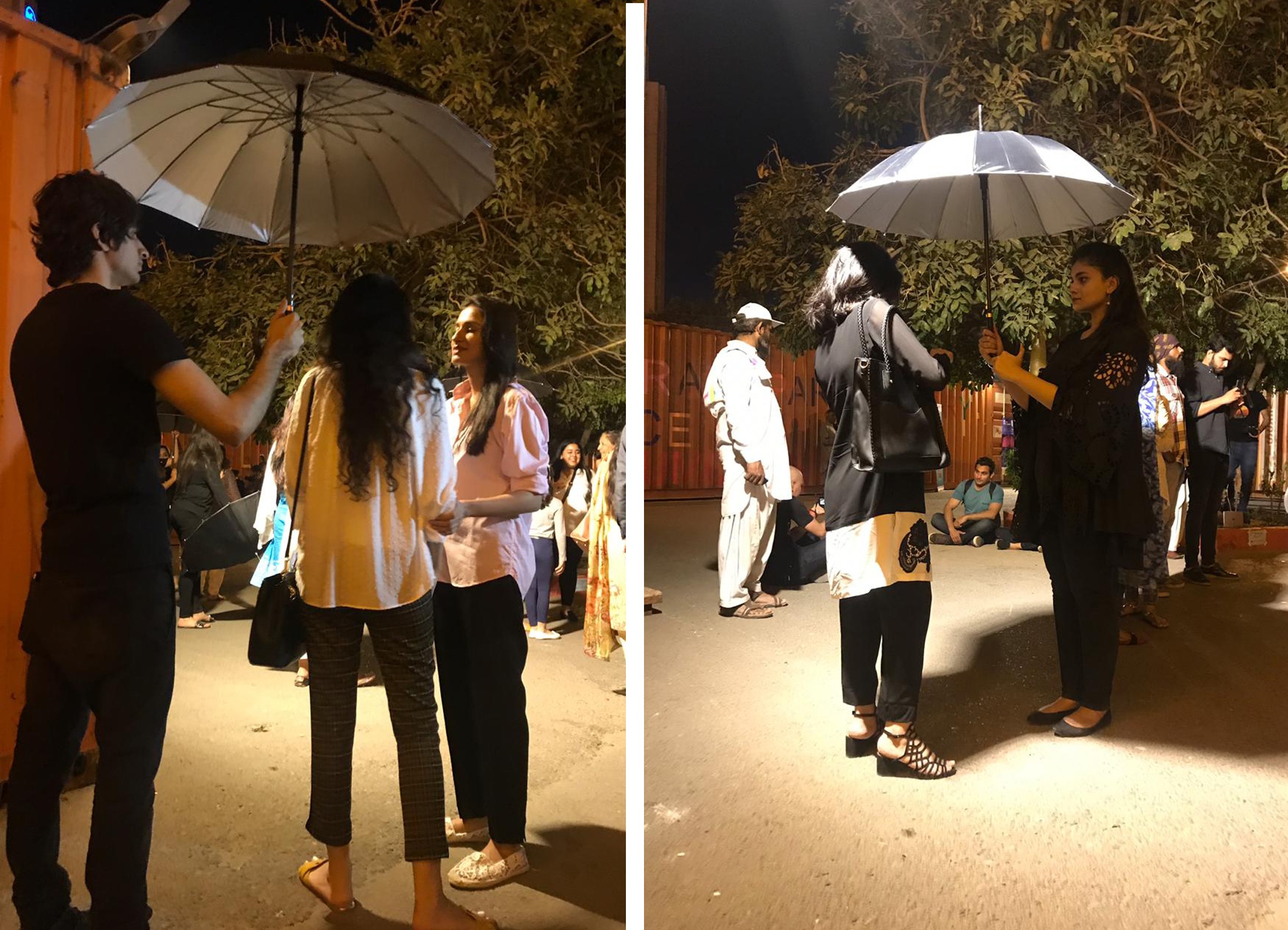 In performace, A group of soberly dressed individuals carrying black umbrellas. When the performance commences, each of these individuals starts following any one member of the audience; sheltering them with an umbrella. They quietly and closely, follow the viewer wherever he goes till the point the viewer responds or decides to leave the premises.