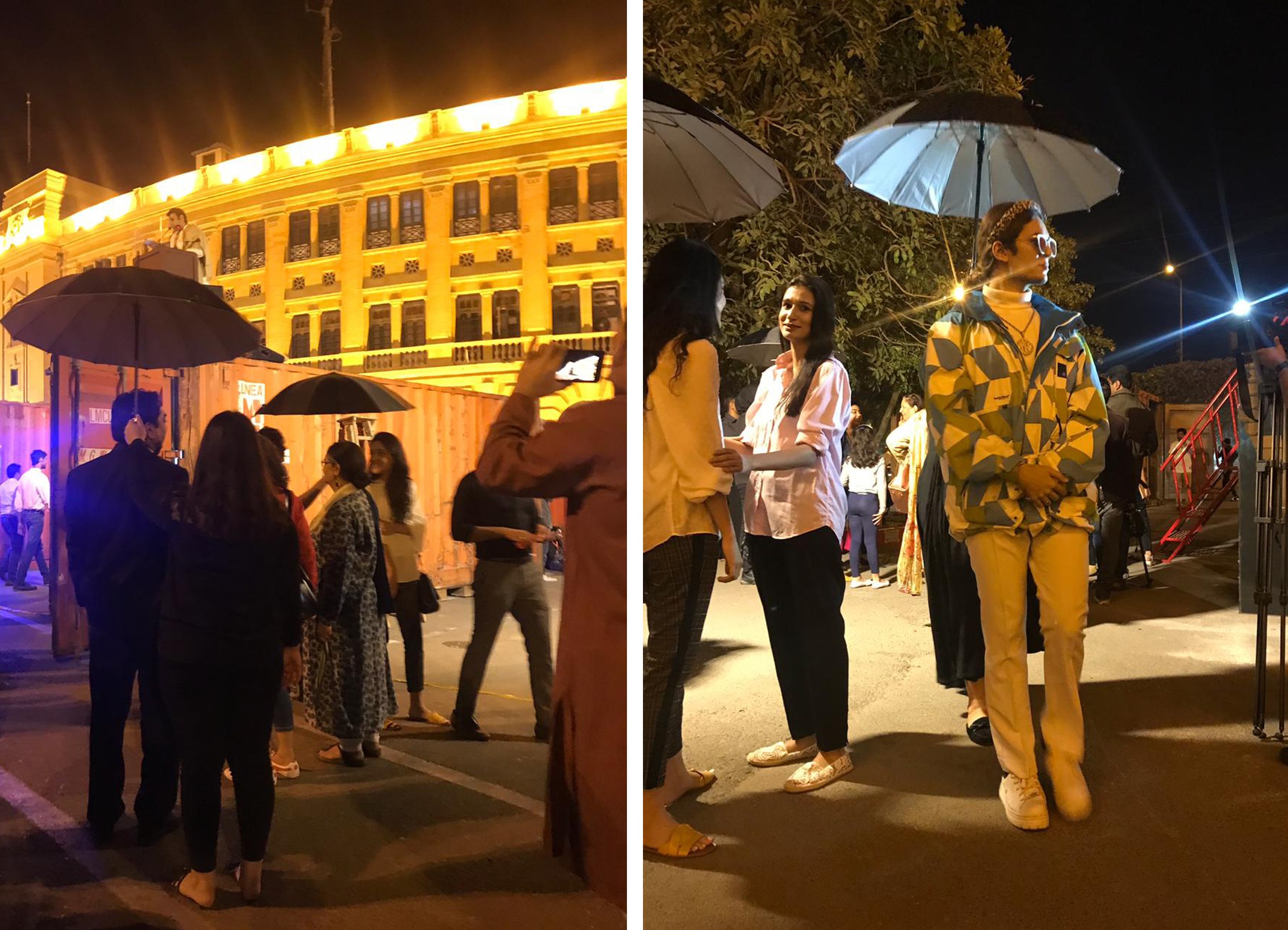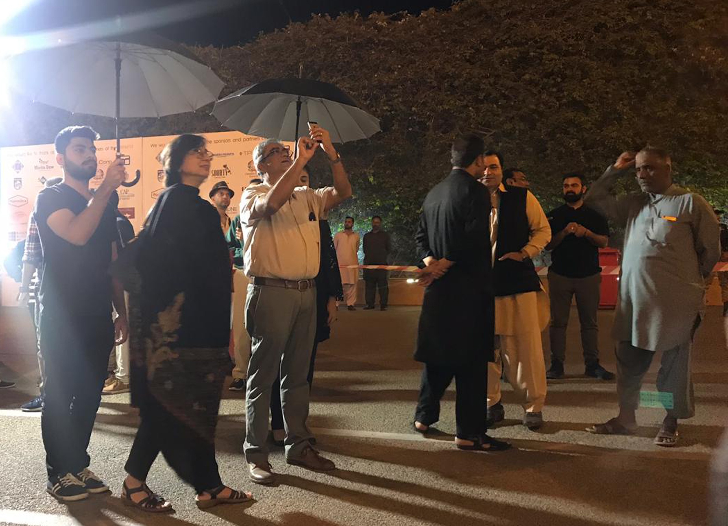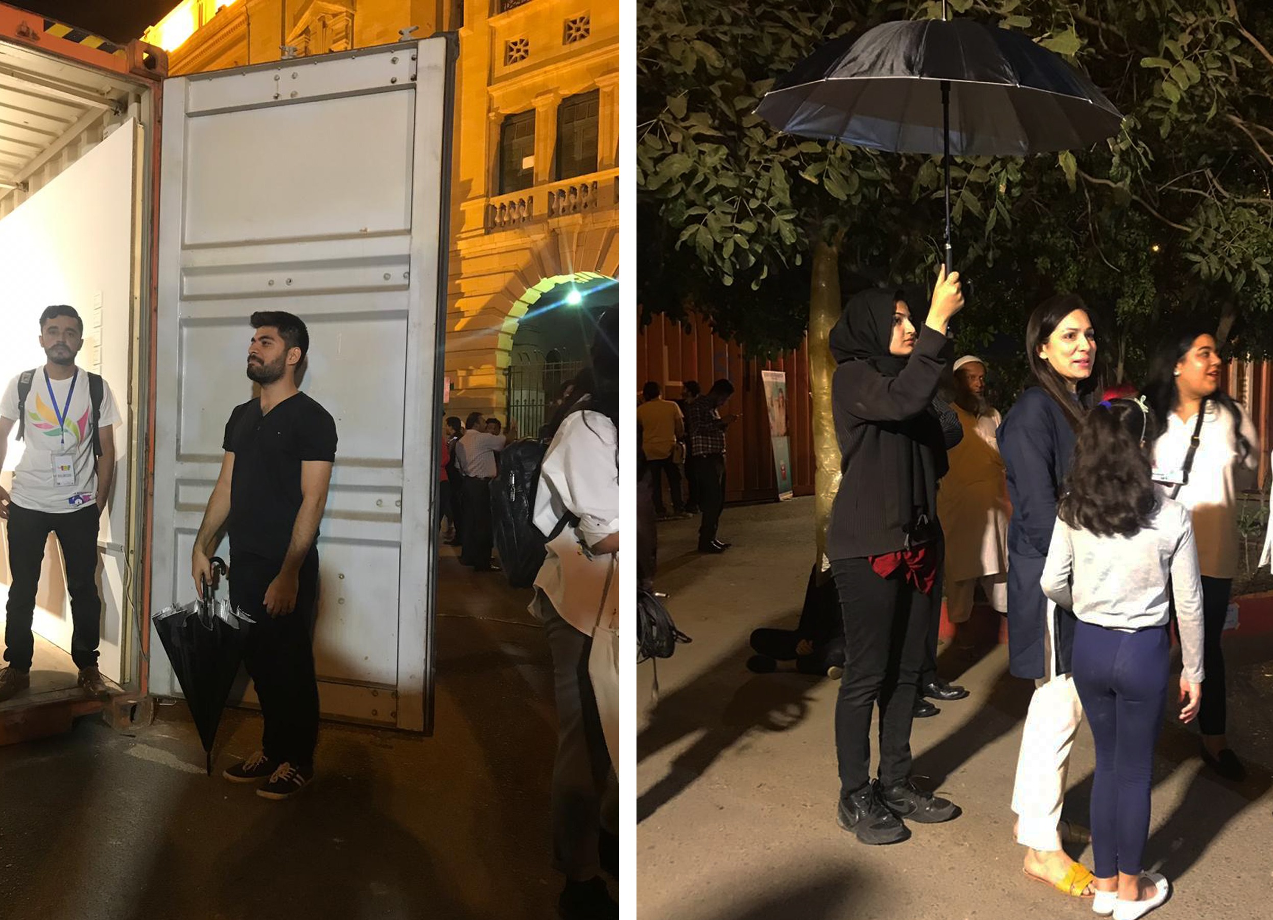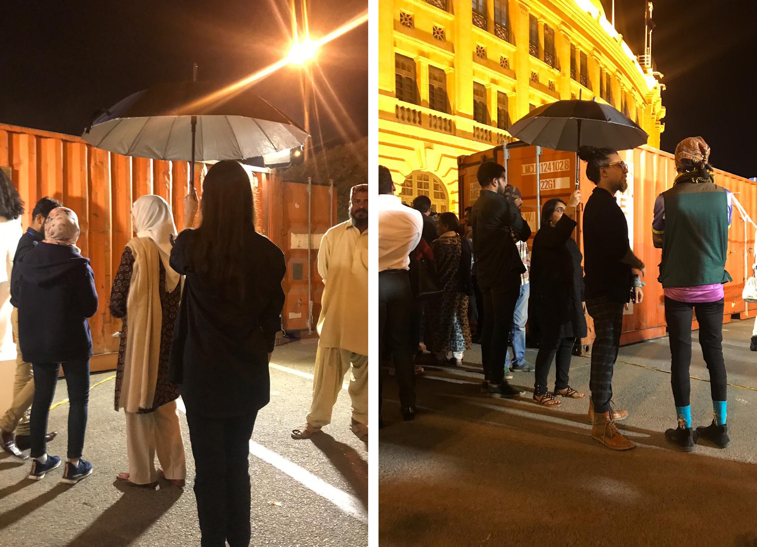 In performace, A group of soberly dressed individuals carrying black umbrellas. When the performance commences, each of these individuals starts following any one member of the audience; sheltering them with an umbrella. They quietly and closely, follow the viewer wherever he goes till the point the viewer responds or decides to leave the premises.