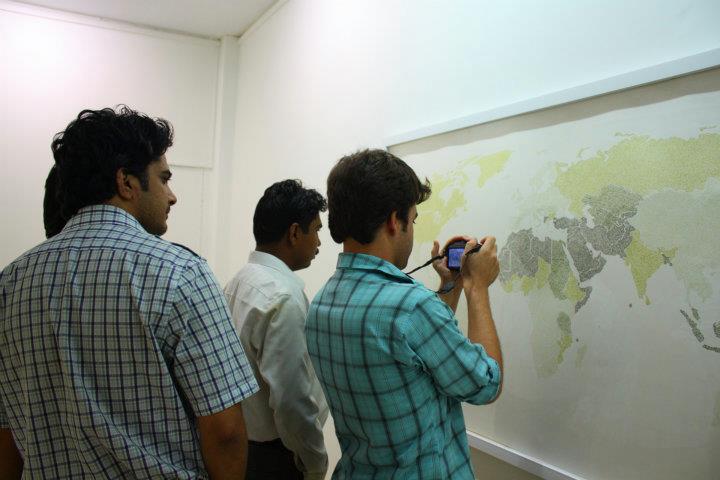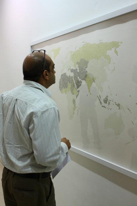 The selected images, the traditions of the script, and the lines of text that Ruheel diligently transcribes are all ‘found’ materials here: borrowed and stolen from cultural history, news media, and the droning voice of the daily broadcasters. Various layers of time and history, therefore, exist in these works. The bodies of Ruheel’s scripts emerge from a deep past, observing from a distance their reiteration in contemporary form. The images that Ruheel collects form a historical middle ground – a not-so-distant past that saw the origination of these visuals: the demographic map, the canonical artwork, or the popular icon. Although they cannot always be read, the words and phrases that Ruheel transcribes exist within a slippery contemporaneity. Extracted from news media, they speak of the artist’s present, and of the political and social events that took place across the days and weeks that he spent producing these pieces. A socio-political ‘background noise’ has infected the space of the artist’s production, and has thus been incorporated, line by colored line, into his work.