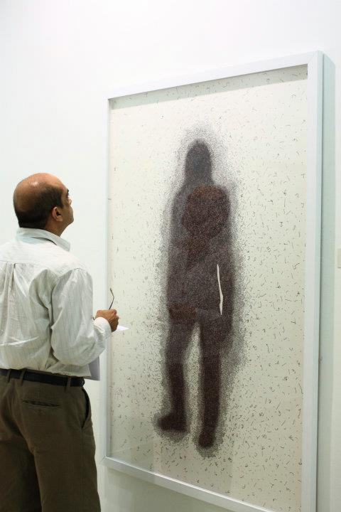 The works Ruheel has conceived for this exhibition utilize the calligraphic script, though rather than the calligrams that he is recognized for, Ruheel’s lines and phrases are densely accumulated in order that images are formed – not through discrete arrangements, but in a massified structure. While Ruheel has played on calligraphic ‘illiteracy’ in the past, in which his audience has been divided between those who could read the scripts and those who could not, in the case of these works, we are all textually illiterate. Though Ruheel’s marks are written, our ‘reading’ must be almost entirely visual.