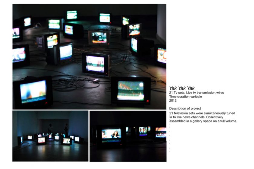 ‘Yak Yak Yak’, was an installation that consisted of 21 television sets, tuned to news channels. All switched on, with their maximum volumes and broadcasting live news simultaneously. The idea was driven by the overdose of information and the disparity within that which is constantly televised in the world today.